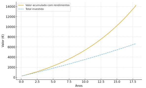Imagine que decide investir 250 € quando o seu filho nasce, fazendo depois reforços mensais de 25 €. Anualmente, atualiza o valor das entregas em 2%, para que o investimento acompanhe a inflação (25 €/mês no primeiro ano, 25,50 € no segundo, 26,01 € no terceiro, e assim sucessivamente).