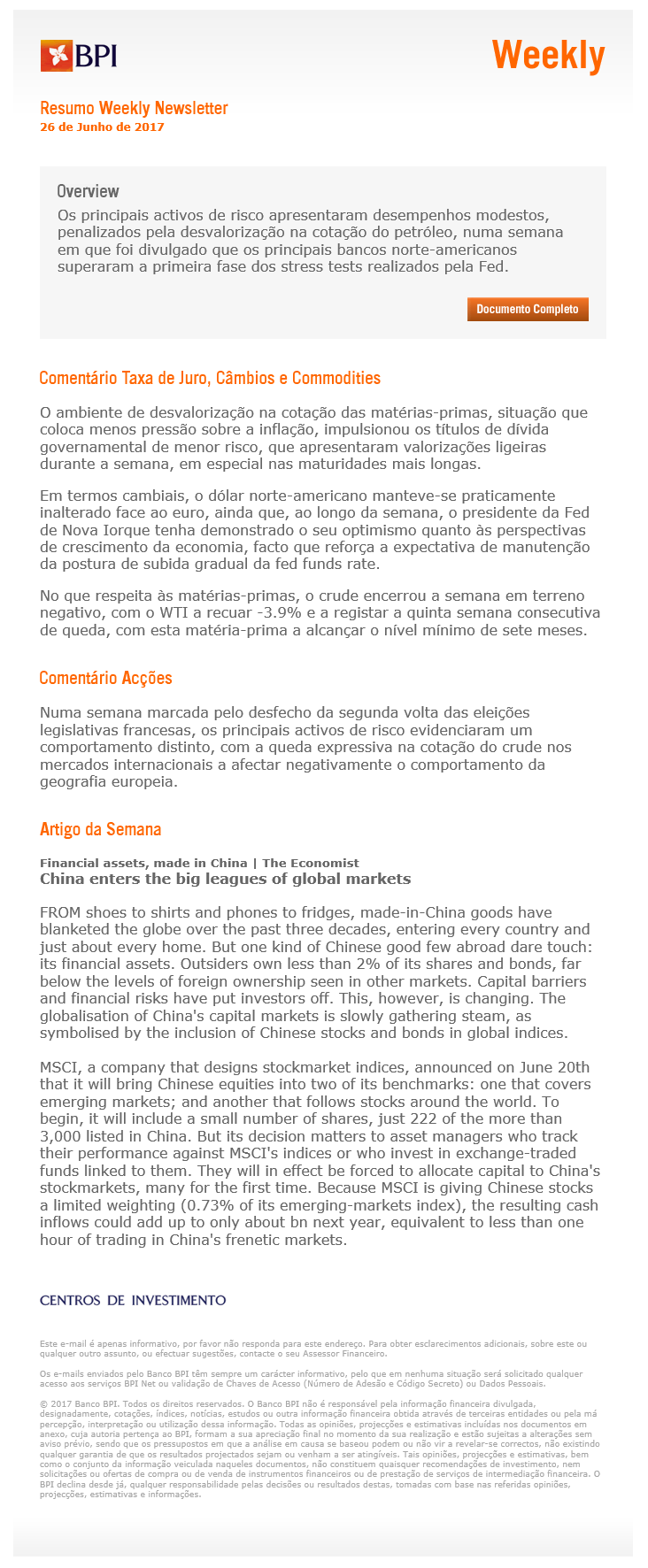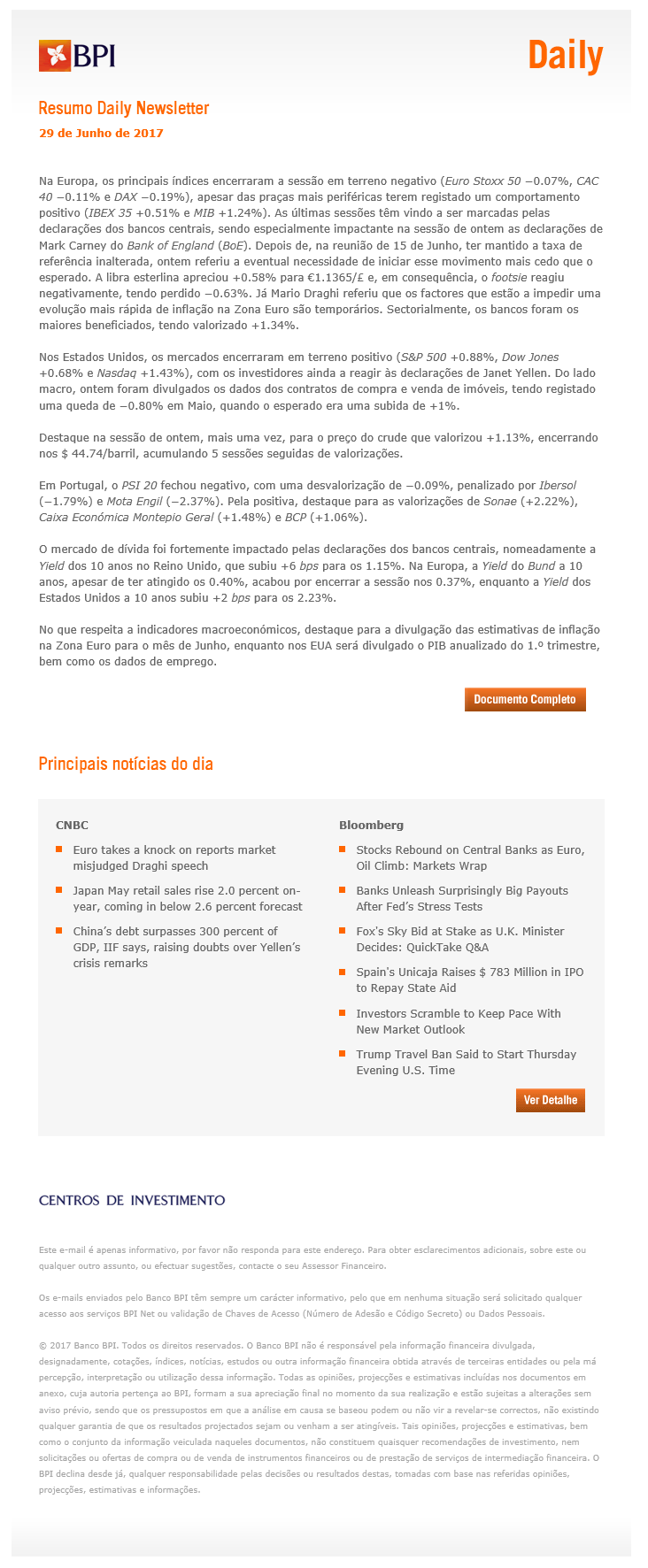 Este documento apresenta-lhe, diariamente, um resumo dos mercados financeiros, bem como: