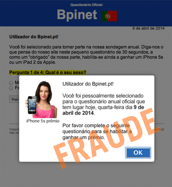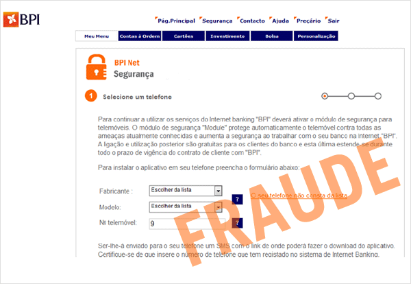 Foram identificadas páginas falsas semelhantes às do acesso aos serviços de Homebanking, que solicitam informações sobre o telemóvel pessoal (Fabricante, Modelo, Nº Telemóvel) e outras informações pessoais. Estes pedidos têm como objectivo a captura de informação confidencial para posterior utilização fraudulenta.